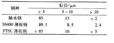 通常認(rèn)為鋼中粒徑在1-50μm的非金屬夾雜物都屬于顯微夾雜物。對于高品質(zhì)特殊用途鋼種,鋼中粒徑小于10μm的顯微夾雜物占有非常大的比例。表l為國內(nèi)幾種特殊鋼中顯微夾雜物的粒徑分布?! ?/p>
