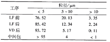 目前,鋼中顯微夾雜物的控制和去除難度較大。在冶煉過程中,鋼水溫度、鋼中成分含量、鋼包吹氬操作、中間包結(jié)構(gòu)以及鑄坯冷卻速率等因素均對鋼中顯微夾雜物的粒徑分布有明顯影響。表2是采用LF-VD-中間包工藝生產(chǎn)軸承鋼時(shí)各工序鋼中顯微夾雜物的粒徑分布。