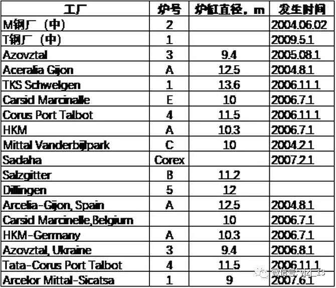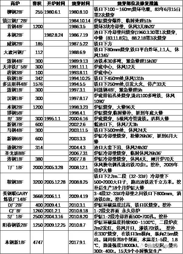 以下針對國內(nèi)外典型高爐爐缸燒出案例進行統(tǒng)計,并對燒出原因、修復(fù)和維護等方面進行詳細(xì)的說明,為國內(nèi)外高爐的長壽提供技術(shù)和數(shù)據(jù)參考。
