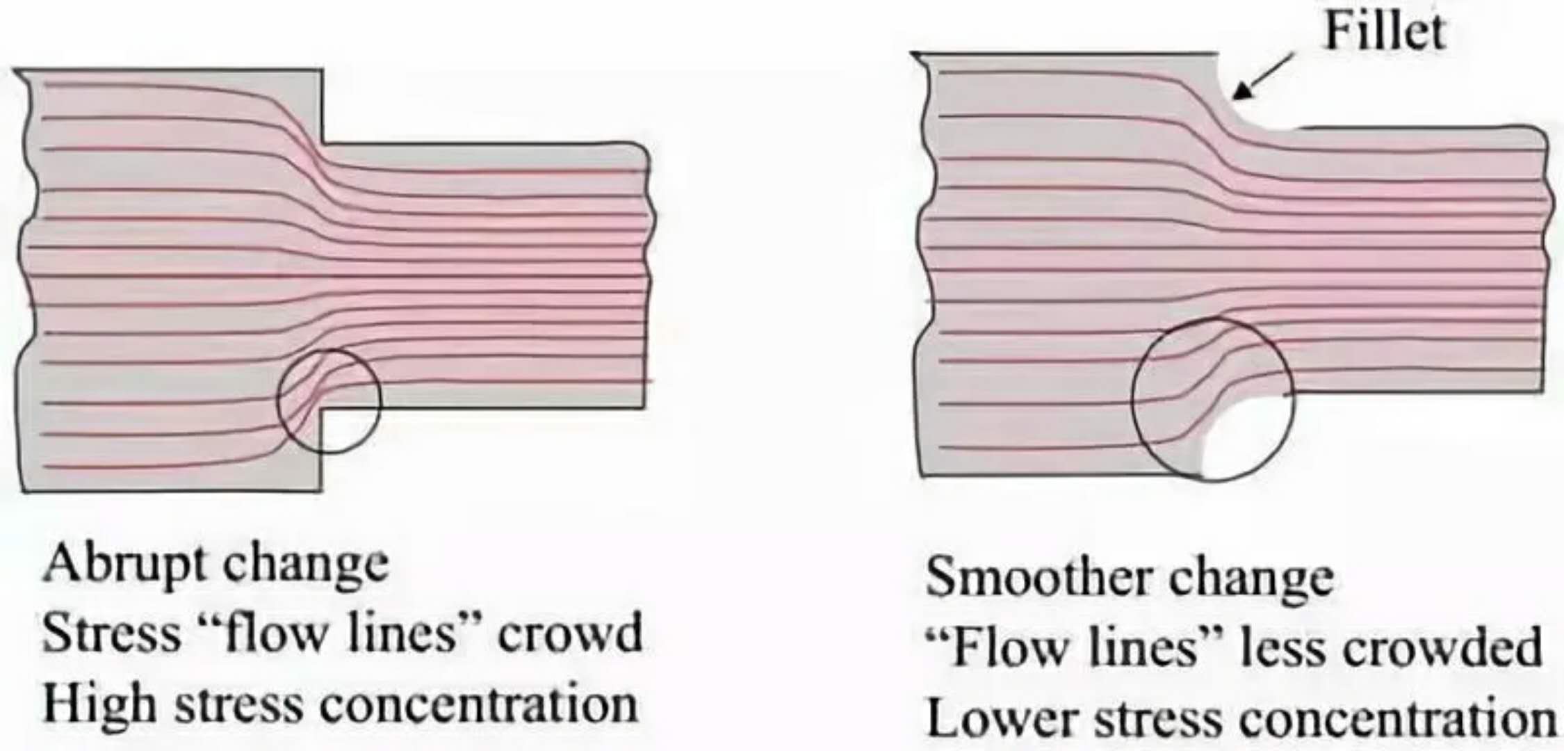 實(shí)際上,所有的疲勞失效都發(fā)生在應(yīng)力集中點(diǎn)或應(yīng)力集中處的零件的外表面上。例如,凹槽、圓角、孔、螺紋、鍵槽、花鍵、焊縫等。如果該部件提供長(zhǎng)期無故障的服務(wù),設(shè)計(jì)者必須考慮到這些應(yīng)力提升器的影響。應(yīng)力集中的作用直接與其半徑小有關(guān)。與先前提到的促進(jìn)疲勞失效的微裂紋一樣,應(yīng)力發(fā)生位置的半徑越小,產(chǎn)生的應(yīng)力越集中越大。有趣的是,應(yīng)力集中對(duì)高延展性的金屬影響很小。其解釋是,由幾何變化引起的應(yīng)力集中被限制在屈服應(yīng)力,止于塑性變形。