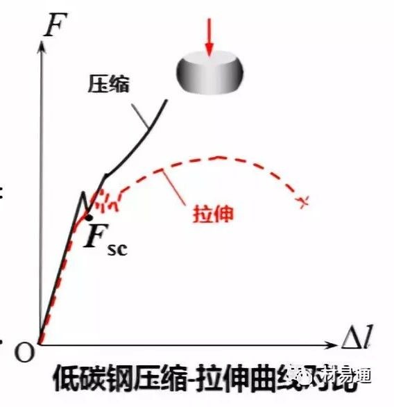 試樣直徑相同時(shí),低碳鋼壓縮曲線和拉伸曲線的彈性階段幾乎重合,屈服點(diǎn)也基本一致。