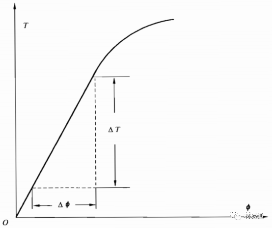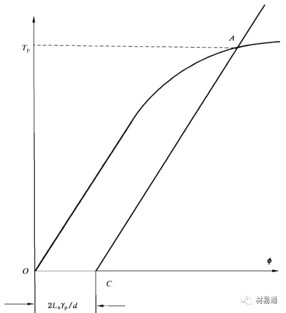 用自動(dòng)記錄方法記錄扭矩—扭角曲線。在曲線上延長(zhǎng)彈性直線段交扭角軸于O點(diǎn),截取OC段,過C點(diǎn)作彈性直線段的平行線CA交曲線于A點(diǎn),A點(diǎn)對(duì)應(yīng)的扭矩為Tp。