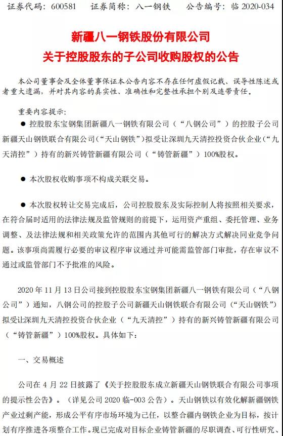 11月13日晚間,八一鋼鐵發(fā)布公告稱,該公司控股股東寶鋼集團(tuán)新疆八一鋼鐵有限公司的控股子公司新疆天山鋼鐵聯(lián)合有限公司擬受讓深圳九天清控投資合伙企業(yè)持有的新興鑄管新疆有限公司100%股權(quán)。11月13日,天山鋼鐵與九天清控簽署了《股權(quán)轉(zhuǎn)讓協(xié)議》。本次股權(quán)轉(zhuǎn)讓以2019年12月31日為基準(zhǔn)日,以公司經(jīng)天健會(huì)計(jì)師事務(wù)所審計(jì)、北京中企華資產(chǎn)評(píng)估有限責(zé)任公司評(píng)估后的100%股權(quán)價(jià)值為基礎(chǔ),各方協(xié)商確定本次股權(quán)轉(zhuǎn)讓價(jià)款為21.81億元。