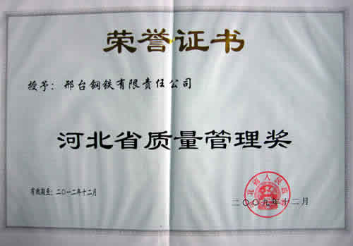 2009年12月,邢鋼榮獲“2009年河北省企業(yè)管理創(chuàng)新優(yōu)勝企業(yè)”榮譽稱號。