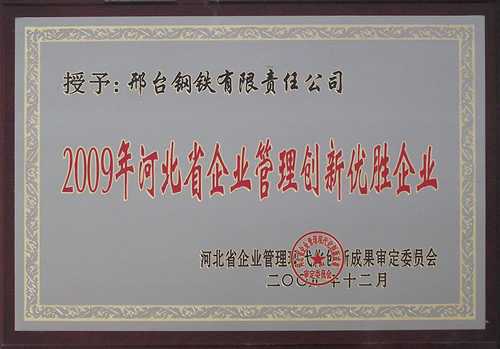 - 邢鋼榮獲“2009年河北省企業(yè)管理創(chuàng)新優(yōu)勝企業(yè)”榮譽稱號