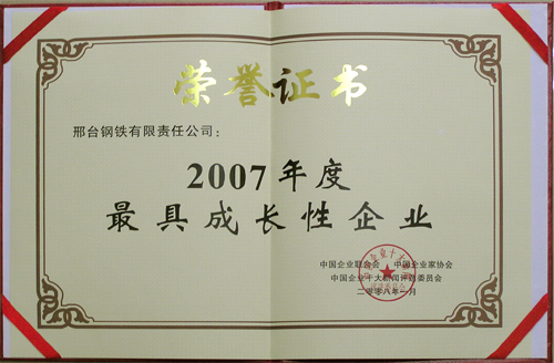 2008年1月,邢鋼榮獲由中國(guó)企業(yè)聯(lián)合會(huì)、中國(guó)企業(yè)家協(xié)會(huì)頒發(fā)的“2007年度最具成長(zhǎng)性企業(yè)”榮譽(yù)稱號(hào)。