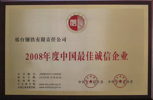 2008年12月,邢鋼榮獲由中國(guó)企業(yè)聯(lián)合會(huì)、中國(guó)企業(yè)家協(xié)會(huì)頒發(fā)的2008年度“中國(guó)最佳誠(chéng)信企業(yè)”榮譽(yù)稱號(hào)。