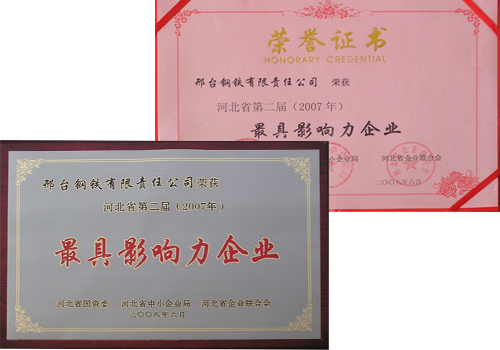 2008年6月,邢鋼榮獲由河北省國(guó)資委、河北省中小企業(yè)局、河北省企業(yè)聯(lián)合會(huì)頒發(fā)的“河北省第二屆最具影響力企業(yè)”榮譽(yù)稱號(hào)。