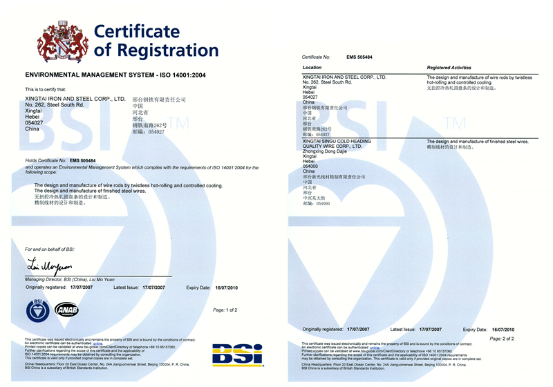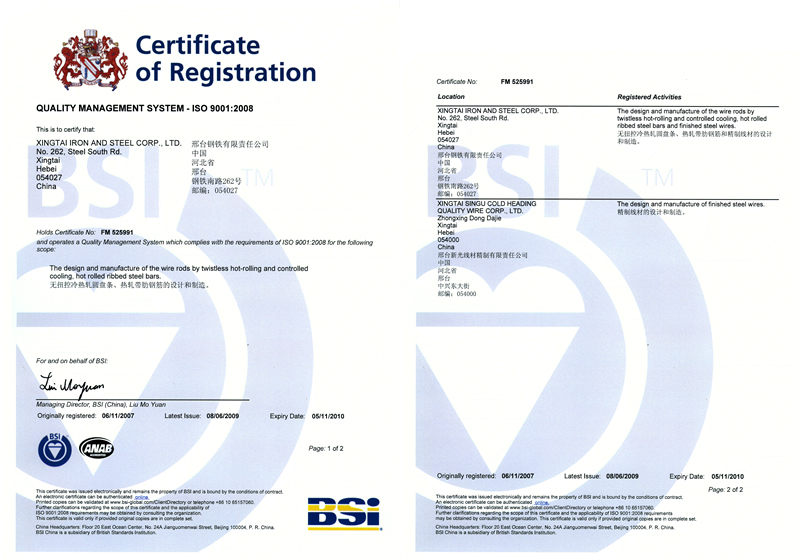2007年8月24日,邢鋼獲ISO/TS 16949:2002認(rèn)證證書(shū)(國(guó)際汽車行業(yè)質(zhì)量管理體系認(rèn)證)。