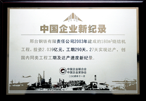 2004年11月,邢鋼2003年建成的180m3燒結(jié)機工程,投資2.039億元,工期290天,27天實現(xiàn)達(dá)產(chǎn),創(chuàng)國內(nèi)同類工程工期及達(dá)產(chǎn)速度新紀(jì)錄。