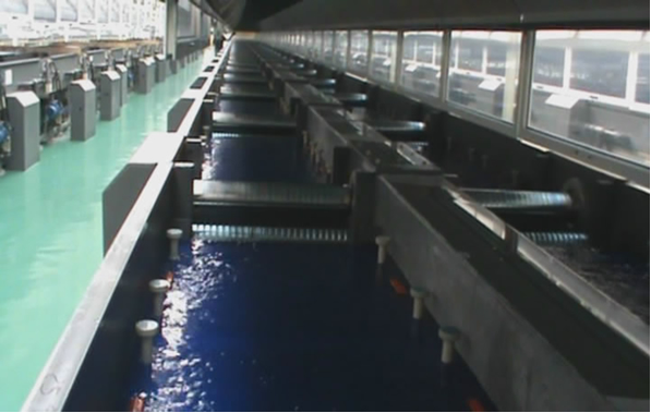 6、鍍銅:屬于堿性鍍銅,分為26線和7+7線,每條線均有21個鍍槽,控制方式為集絲集控和單絲單控, 7+7型為單絲單控,可以同時生產(chǎn)14種規(guī)格和工藝各不相同的鋼絲,每條線的工藝參數(shù)如電流和速度等都可以單獨控制。而26線為集絲集控,其中26線采用銅粒做為消耗補充,7+7線采用銅板作為消耗補充。