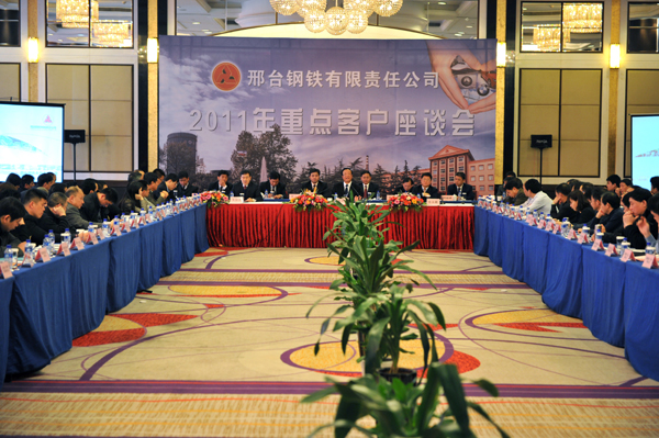 董事長、總經(jīng)理袁世臻在講話中首先代表公司熱情歡迎客戶代表在百忙之中參加座談會,對與會代表常年來給予邢鋼的大力支持表示感謝。袁總說,2011年,國際經(jīng)濟環(huán)境復雜多變,歐債危機進一步深化蔓延,全球金融市場動蕩形勢嚴峻。由于外圍經(jīng)濟的不確定和不穩(wěn)定性,加上國內(nèi)通脹壓力持續(xù)加大,國內(nèi)鋼鐵生產(chǎn)高位釋放,鋼鐵下游需求增速放緩,國內(nèi)鋼鐵市場在供大于求、金融屬性凸顯的整體形勢下,呈現(xiàn)頻繁波動特征。在國際、國內(nèi)市場不利情況下,邢鋼繼續(xù)堅持“做精、做專、做強”的發(fā)展戰(zhàn)略,在穩(wěn)定生產(chǎn)規(guī)模的同時,大力推進技術(shù)創(chuàng)新,工藝結(jié)構(gòu)、產(chǎn)品結(jié)構(gòu)不斷優(yōu)化,隨著不銹鋼項目和公司第二條280*325mm大方坯連鑄生產(chǎn)線的正式投產(chǎn),邢鋼已經(jīng)實現(xiàn)100%全精煉生產(chǎn),成為真正意義上的從超低碳、低碳、中碳、高碳到合金鋼、重熔鋼、不銹鋼全系列線材生產(chǎn)企業(yè)。