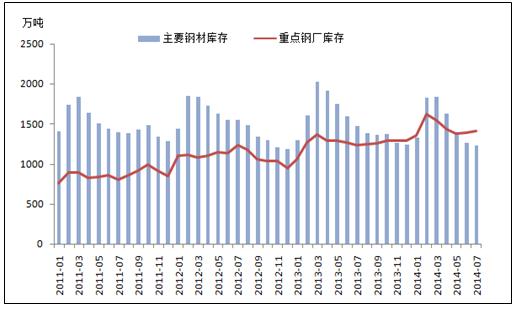 目前,中國鋼材市場正處于去庫存時(shí)期,主要鋼材的庫存量正在快速減少。據(jù)我的鋼鐵數(shù)據(jù)庫顯示截止2014年8月8日,中國主要鋼材庫存量為1190.35萬噸,與去年相比下降202萬噸,同比降幅為14.5%。3月至7月的平均降速達(dá)到9.62%,已大幅度超過以往的去庫存速度。庫存量的快速下降,一般意味著下游行業(yè)對(duì)鋼材需求的增加,鋼材市場的情況理應(yīng)十分良好,但實(shí)際上鋼材的價(jià)格卻是不增反降。據(jù)悉,中國7月的Myspic普鋼絕對(duì)價(jià)格指數(shù)為3393.54元/噸,同比下降8.56%。