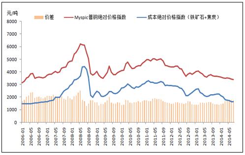 鋼鐵行業(yè)的原材料主要是鐵礦石和焦炭,近期原材料和鋼材的價(jià)格一直處于下跌狀態(tài)。截止2014年8月12日中國的焦炭絕對(duì)價(jià)格指數(shù)為931.8元/噸,同比下降19.33%;鐵礦石的絕對(duì)價(jià)格指數(shù)為699元/濕噸,同比下降27.55%;Myspic普鋼絕對(duì)價(jià)格指數(shù)為3380.68元/噸,同比下降9.8%,原材料價(jià)格下降速度遠(yuǎn)大于鋼鐵。