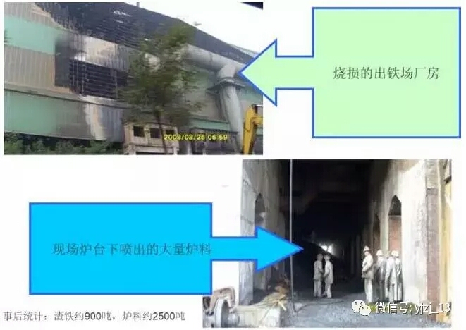 事后確認(rèn):4#鐵口下方爐缸燒穿,大量渣鐵和炙熱的爐料(焦炭、礦石)噴出,現(xiàn)場燒損嚴(yán)重(新3高爐本體電纜、煤粉噴吹總線電纜、新2高爐電源電纜、計量儀表電纜、出鐵場天棚、4#爐前炮、開口機、東場及北場爐前吊車、爐前休息室、電梯等燒損。)