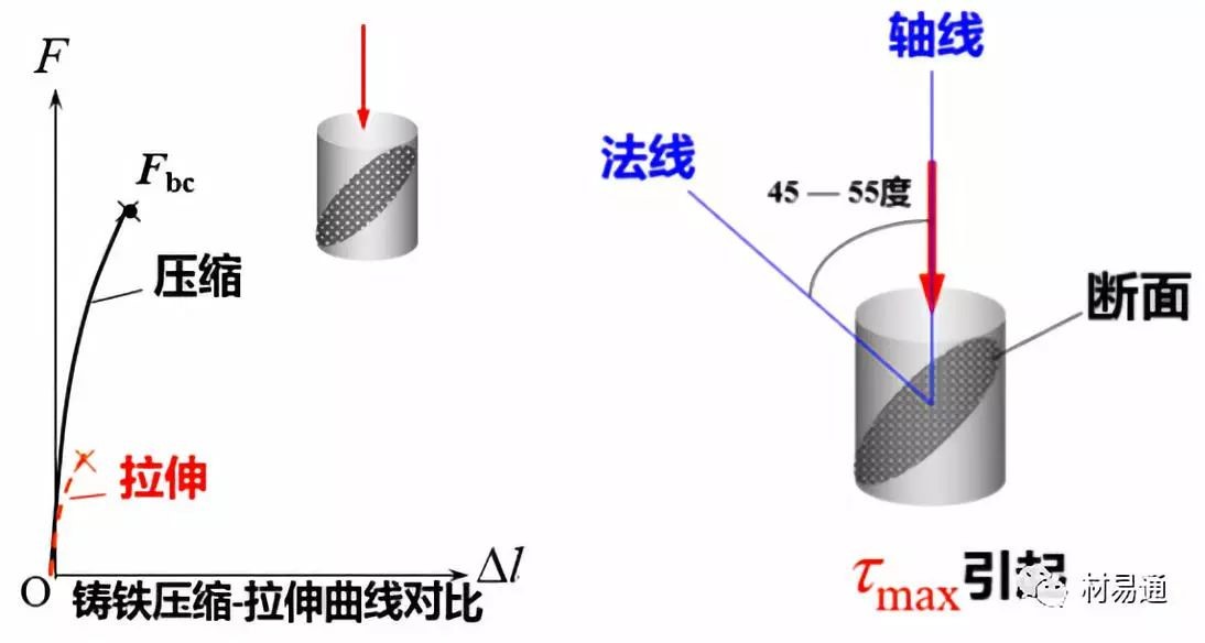 表明斷裂是由最大拉應(yīng)力引起的。而最大拉應(yīng)力先于最大剪應(yīng)力達(dá)到強(qiáng)度極限后發(fā)生斷裂又說明了鑄鐵的抗拉能力弱于其抗剪能力。