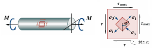 純扭轉(zhuǎn)時(shí)圓試樣的表面處于純剪應(yīng)力狀態(tài),與桿軸成±45º角的螺旋面上分別作用著兩個(gè)主應(yīng)力: σ1、σ3 并與最大剪應(yīng)力τmax絕對(duì)值數(shù)值相等。因此試樣的斷口角度直接顯示材料是拉斷還是剪斷、材料自身抗拉、抗剪能力的強(qiáng)弱由此得到直接地比較。
