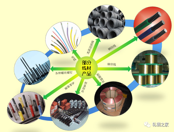 線材的用途非常廣泛,除建筑用線材等可直接被應用的成品之外,一般都要經過深加工才能制成產品。深加工的方式有熱鍛、溫鍛、冷鍛、拉拔、擠壓、回轉成形和切削等,為了便于進行這些深加工,加工之前需要進行退火、酸洗等處理。加工后為保證使用時的機械性能,還要進行淬火、正火或滲碳等熱處理。有些產品還要進行鍍層、噴漆、涂層等表面處理。部分線材產品如下圖所示。