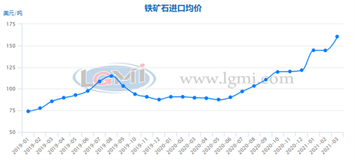 一季度鋼鐵原料價格明顯上漲。據(jù)蘭格鋼鐵云商平臺監(jiān)測數(shù)據(jù)顯示,一季度海關進口鐵礦石均價為150.8美元/噸,較2020年一季度上漲66.4%;唐山二級冶金焦均價為2560元/噸,較2020年一季度上漲39.1%;唐山重廢均價為3081元/噸,較2020年一季度上漲23.5%。在原料價格上漲帶動下,鋼鐵生產(chǎn)成本大幅上漲,據(jù)蘭格鋼鐵研究中心測算數(shù)據(jù)顯示,2021年一季度普碳方坯成本較2020年上漲849元/噸,漲幅達31.3%。