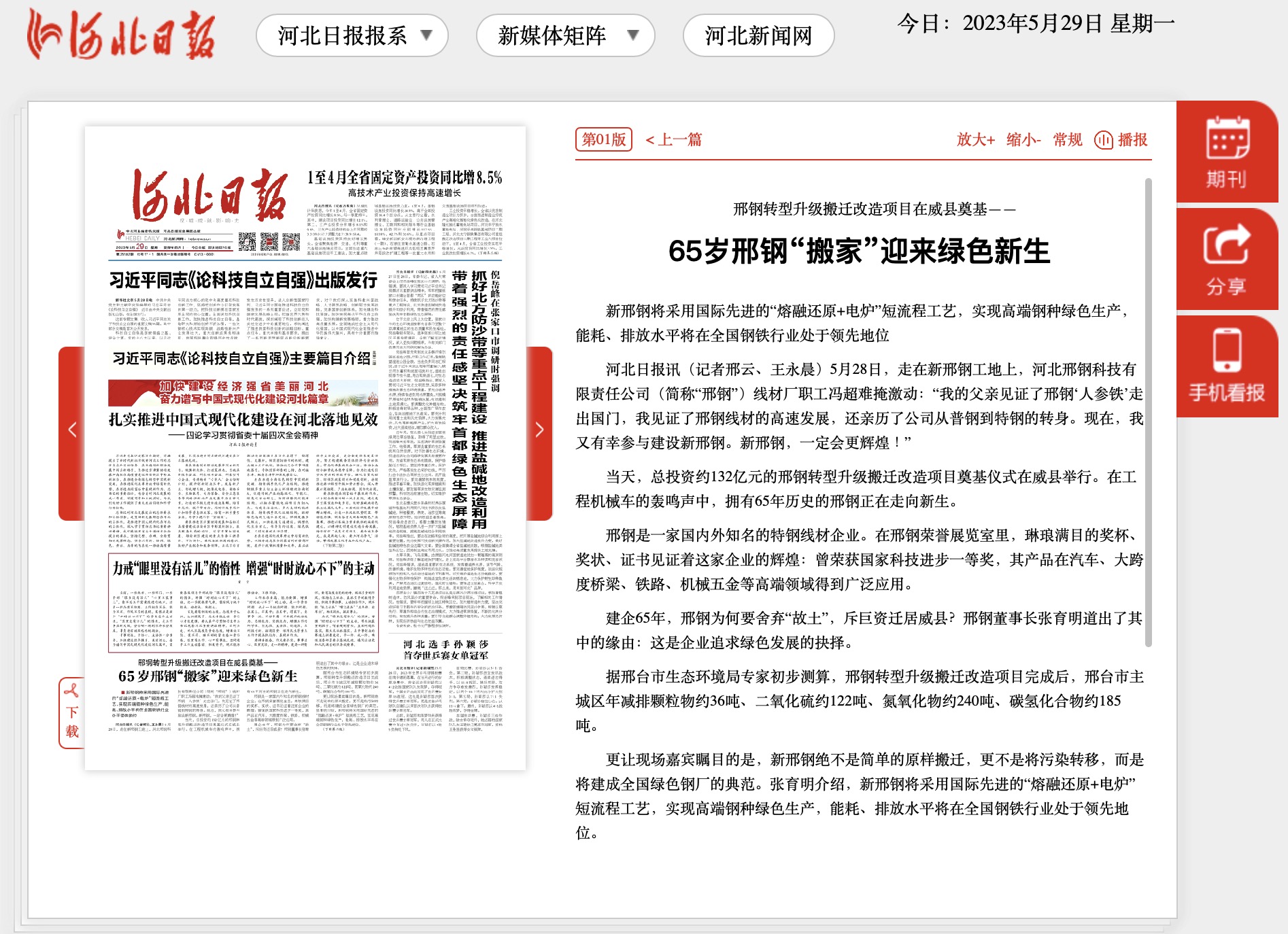 According to the preliminary estimation by experts from Xingtai Ecology and Environment Bureau, after the completion of relocation and renewal project, the annual emission reduction of particulate matter, sulfur dioxide, nitrogen oxides and hydrocarbons will be about 36 tons, 122 tons, 240 tons and 185 tons respectively in the main city of Xingtai.