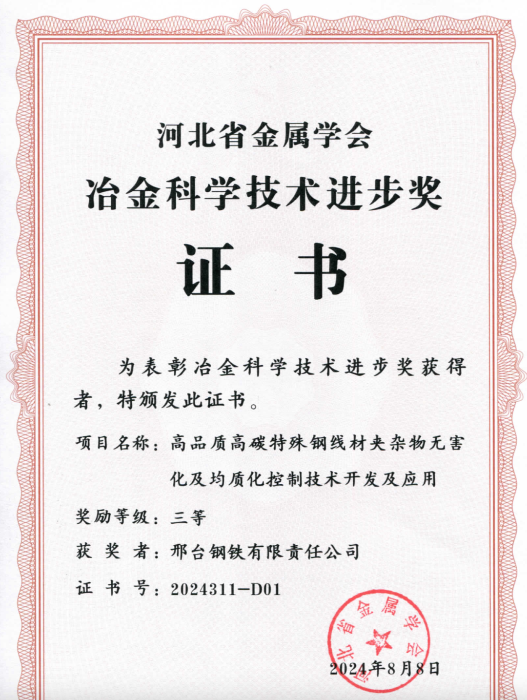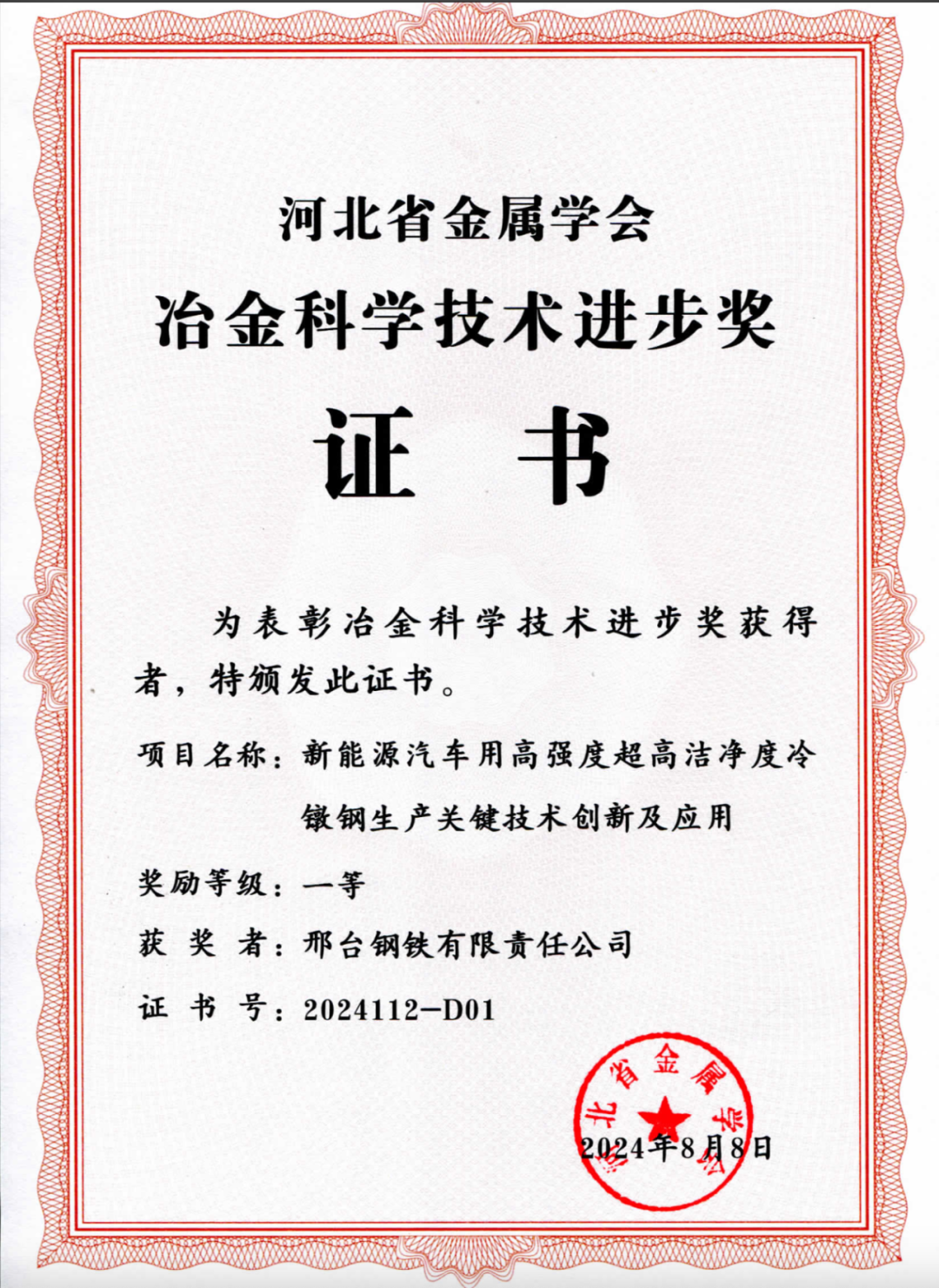 近日,邢臺鋼鐵有限責(zé)任公司兩項科技成果“新能源汽車用高強度超高潔凈度冷鐓鋼生產(chǎn)關(guān)鍵技術(shù)創(chuàng)新及應(yīng)用”“高品質(zhì)高碳特殊鋼線材夾雜物無害化及均質(zhì)化控制技術(shù)開發(fā)及應(yīng)用”得到河北省金屬學(xué)會專家評審委員會的高度認(rèn)可,分別榮獲2024年度 “河北冶金科學(xué)技術(shù)獎”一、三等獎。