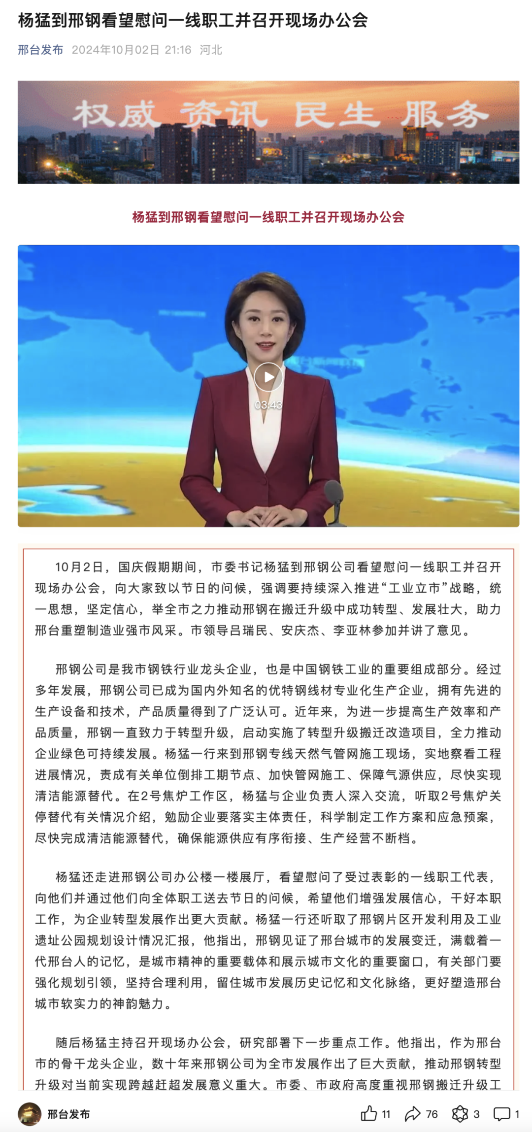 10月2日,國慶假期期間,市委書記楊猛到邢鋼公司看望慰問一線職工并召開現(xiàn)場辦公會,向大家致以節(jié)日的問候,強調(diào)要持續(xù)深入推進“工業(yè)立市”戰(zhàn)略,統(tǒng)一思想,堅定信心,舉全市之力推動邢鋼在搬遷升級中成功轉(zhuǎn)型、發(fā)展壯大,助力邢臺重塑制造業(yè)強市風采。市領(lǐng)導呂瑞民、安慶杰、李亞林參加并講了意見。