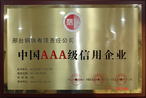 日前,在由中國合作貿易企業(yè)協(xié)會、中國企業(yè)改革與發(fā)展研究會、全國企業(yè)信用評價辦公室組織召開的中國企業(yè)科學發(fā)展論壇暨誠信表彰大會上,邢鋼被評為2010年度“中國AAA級信用企業(yè)”、公司榮獲“全國文明誠信示范單位” 稱號、董事長、總經(jīng)理袁世臻榮獲“全國優(yōu)秀誠信企業(yè)家” 稱號。